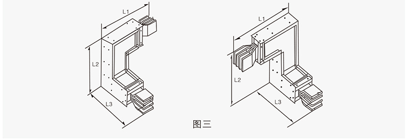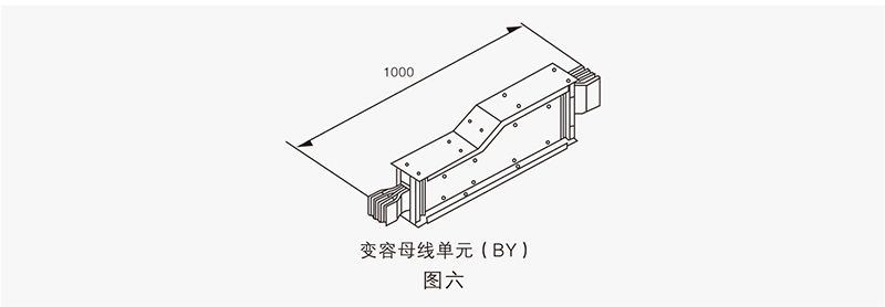 變?nèi)菽妇€主要用于同一系統(tǒng)中不同額定電流單元的連接,以使整個(gè)母線槽系統(tǒng)更加經(jīng)濟(jì)實(shí)用。其標(biāo)準(zhǔn)長度為1000mm,也可根據(jù)用戶要求定制尺寸。見圖六