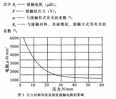 由公式(2)可知,影響母線槽搭接面接觸電阻的主要因素有表面的條件K、m和所施加的壓力F。當(dāng)母線槽表面處理和接觸面積確認(rèn)了,則Kj、m也確認(rèn)了,于是接觸電阻Rj與壓力F成為反比聯(lián)系,壓力F越大,接觸電阻Rj越小。圖5是壓力對(duì)兩片銅導(dǎo)體聯(lián)接處接觸電阻的影響曲線圖。