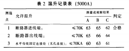 表2是溫升實(shí)驗(yàn)室的質(zhì)檢人員按照國(guó)家規(guī)范GB7251.1-1997的有關(guān)條款對(duì)該樣柜進(jìn)行溫升實(shí)驗(yàn),對(duì)整個(gè)母線槽系統(tǒng)的關(guān)鍵處和搭接面進(jìn)行丈量(測(cè)得部分溫升記載)