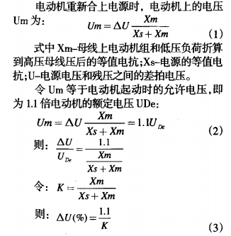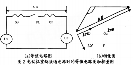 圖2所示為電動(dòng)機(jī)從頭接通電源時(shí)的等值電路圖和相角圖,從圖中能夠看出,不同的0角(電源電壓和電動(dòng)機(jī)殘壓二者之間的夾角),對(duì)應(yīng)不同的△U值,如0=180o時(shí),AU值最大,假定此刻從頭合上電源,對(duì)電動(dòng)機(jī)的沖擊最嚴(yán)峻。依據(jù)母線槽上成組電動(dòng)機(jī)的殘壓特性和電動(dòng)機(jī)耐受電流的才干,在極坐標(biāo)上可繪出其殘壓曲線。