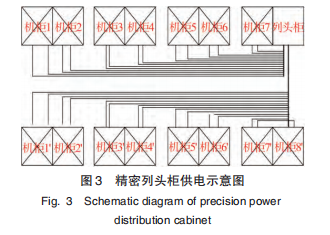 計(jì)劃2:假如選用傳統(tǒng)的精細(xì)列頭柜配電計(jì)劃,則需為兩列機(jī)柜配置 1個(gè)精細(xì)列頭柜,并向每面機(jī)柜提供雙電源供電。如圖3所示。